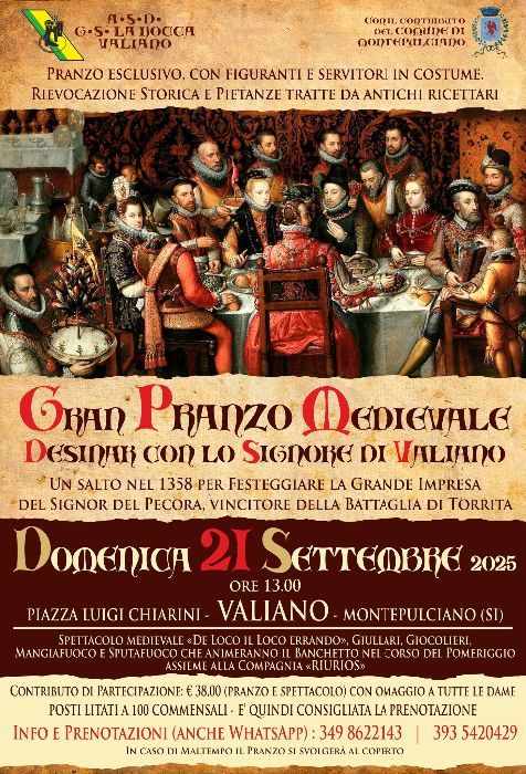 Anno Domini 1358, gran pranzo medievale con il Signore di Valiano, per celebrare la grande impresa del Signor del Pecora, vittorioso nella Battaglia di Torrita, il borgo di Valiano vi invita a prendere parte a un banchetto senza tempo.